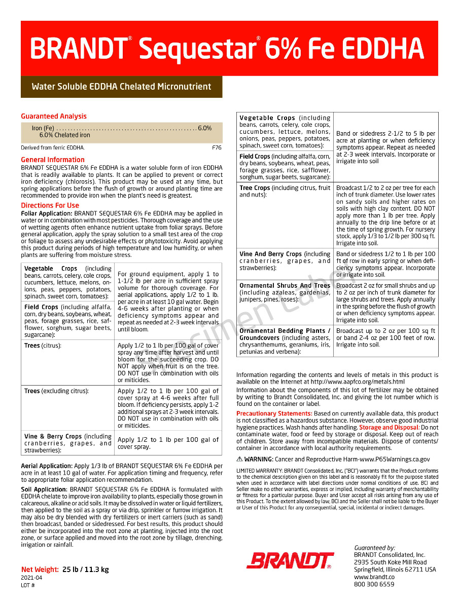 NBR034 Brandt Sequestar 6% Iron (Fe) EDDHA Water-Dispersible Granule - 25 Pound (54/Plt) |