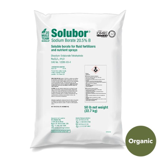 The best choice for foliar applications, OMRI listed Solubor is formulated to disperse quickly in liquid, leaves minimal residue, and provides an economical source of boron. Solubor combines the highest boron concentration with the maximum possible dispersion and solubility in water, making it ideal for use in agro-industrial markets and farm sprays.