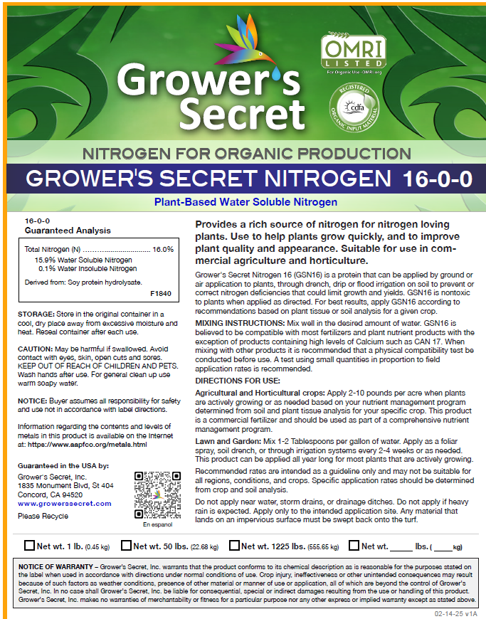 Grower's Secret Nitrogen 16-0-0 - OMRI Certified