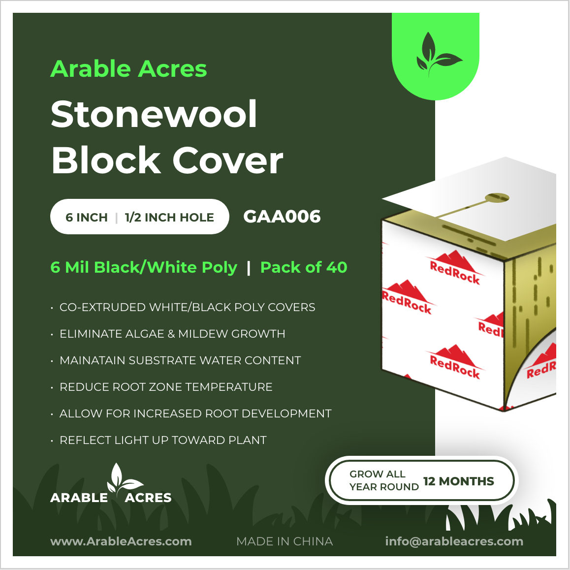 GAA006 Arable Acres Stonewool Block Cover - 6 Mil Black/White Poly - 1/2-Inch Stalk Hole - 1/4-Inch Emitter Hole - 6-Inch x 6-Inch (Pack of 40) (30/Cs) |