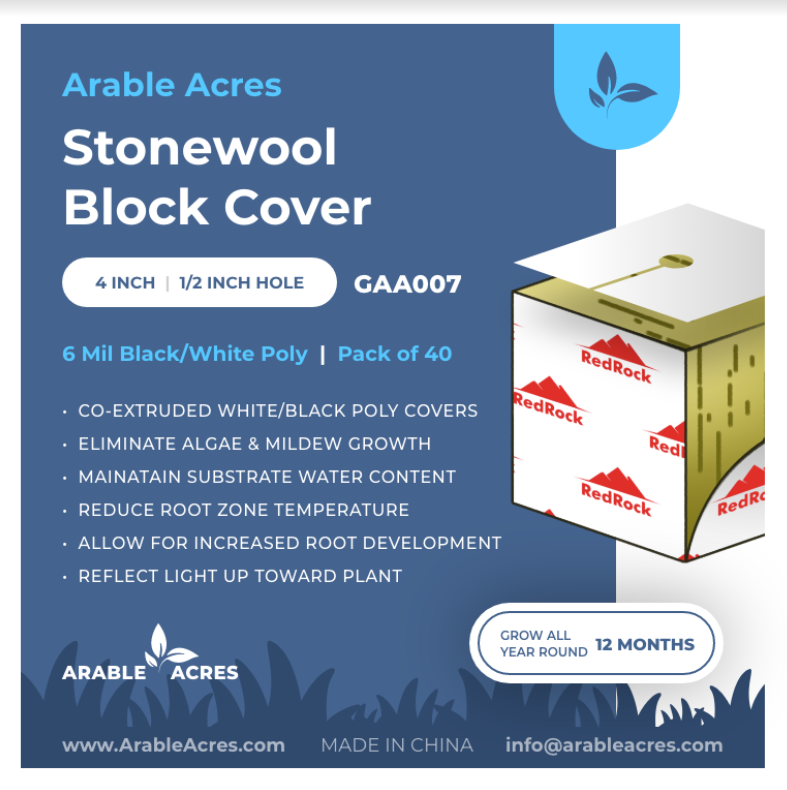 Hydroponic crop production gives cultivators complete control over nutritional content in the root zone, irrigation frequency & duration, and many other plant specific variables. Arable Acres Stonewool Block Covers assist growers in further pushing their crops' potential by preventing unwanted substrate evaporation, redirecting light up toward leaves, and stopping algae growth before it starts. Our 6 Mil heavy-duty poly covers are the industries most durable and long-lasting.